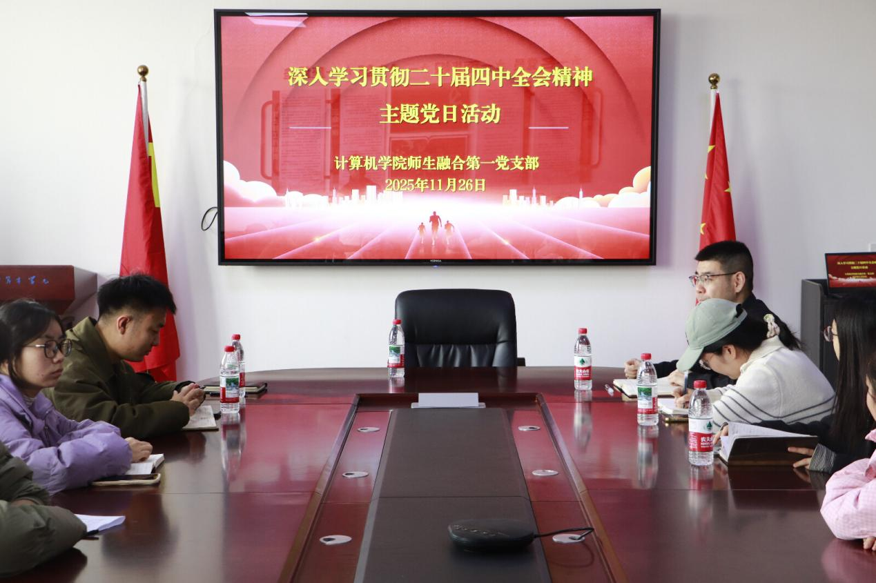 为深化党的二十届四中全会精神学习教育,不断提升学习教育实效,推动学习成果转化为学习工作动能,11月26日下午,计算机学院师生融合第一党支部于同心楼5406会议室召开深入学习贯彻党的二十届四中全会精神主题党日活动,支部书记李雷玮及支部党员代表参会。会议由李雷玮主持。