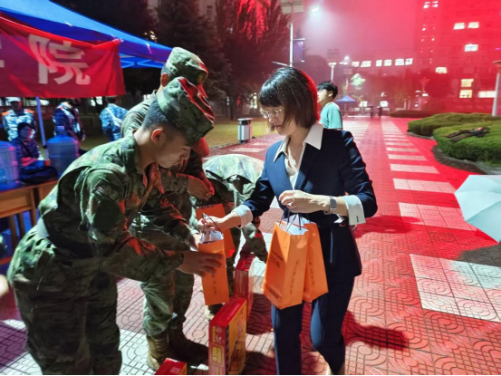 看望现场,学院领导与同学们亲切互动。国庆节及中秋佳节将近,为了让教官们感受到家的温暖,张俊娜代表学院送上深切关怀与节日祝福,并分发了节日慰问品。