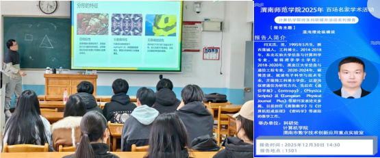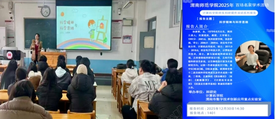 2025年12月30日下午,计算机学院孙萧寒博士、闫文浩博士分别为师生做了《科学精神与科学思维》《混沌理论纵横谈》学术讲座,计算机学院师生代表参会,报告会由李云飞副院长主持。
