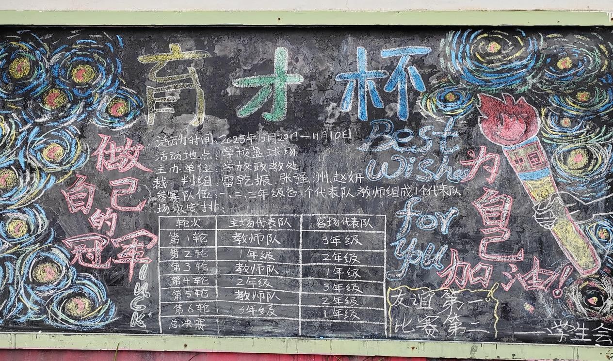 本周学校举办了“育才杯”校园篮球赛。我们协助政教处老师做好赛事的组织工作,包括赛前布置场地、维持比赛期间的观众秩序、提醒学生注意安全等,保障篮球赛进行。