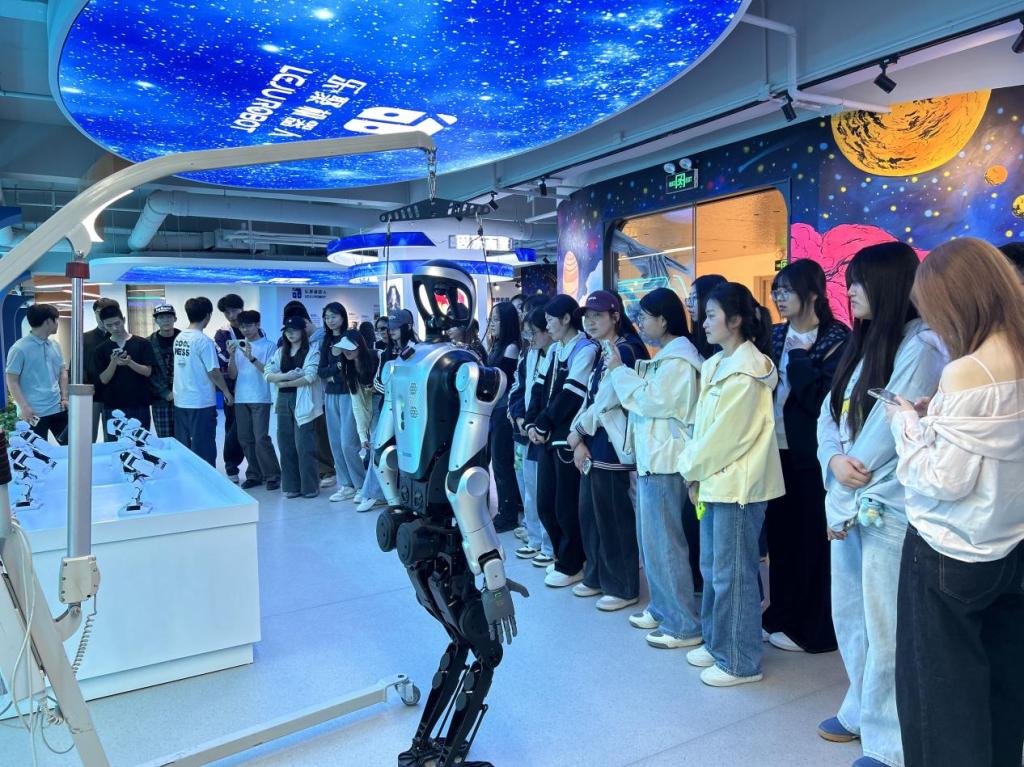 师生一行首先抵达未央(乐聚)人工智能学习体验中心。在体验中心讲解员的引导下,同学们系统参观了人工智能发展历程展区、前沿技术应用场景区以及人机交互体验区。讲解员结合智能机器人、机器狗、智能语音交互系统等典型产品,生动展示了AI技术在智能制造、智慧家庭、智慧医疗等领域的实际落地案例。