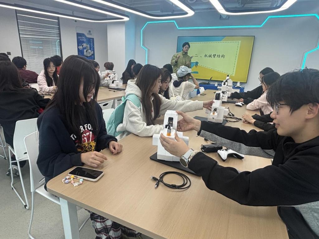 在机器人编程演示环节,技术人员现场操作人形机器人完成复杂动作序列,并邀请学生亲自体验图形化编程与动作设计流程。同学们踊跃参与,通过编写简单指令,让机器人实现行走、舞蹈、语音应答等任务,切身感受到从算法到实物执行的完整技术链条。此外,体验中心还设置了AI绘画、人脸识别、智能驾驶模拟等互动项目,数字媒体技术专业的学生对AI在图像生成、交互艺术等方向的应用表现出浓厚兴趣,与技术人员就技术原理、创作工具及行业前景展开了热烈讨论。