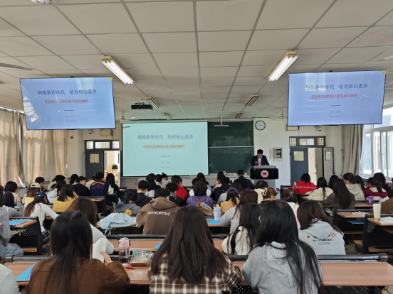 随后,王忠社老师围绕信息科技课程改革背景、新课程标准核心框架、学科核心素养内涵、现行教材编排逻辑与教学实施重难点等多个维度,展开条理清晰、内容翔实的深度解析。讲座结合数智时代教育变革的大趋势,系统拆解了信息科技课程的育人目标、学段能力进阶要求、跨学科融合教学路径等关键内容,通过鲜活的教学案例、前沿的行业发展数据,直观展示了新课标、新教材对信息科技专业学习者提出的全新能力要求与发展方向。现场同学全程专注、认真记录要点,深入思考讲座内容,主动对照自身专业学习与未来职业发展规划查漏补缺,对于课程标准、教材落地应用等重难点问题有了更为系统、透彻的认知。